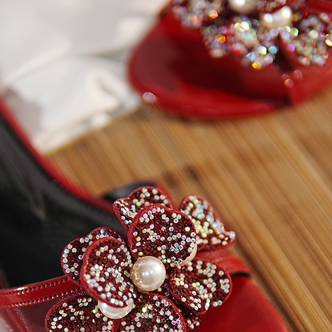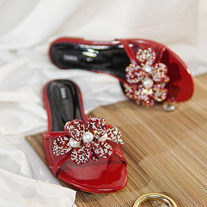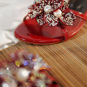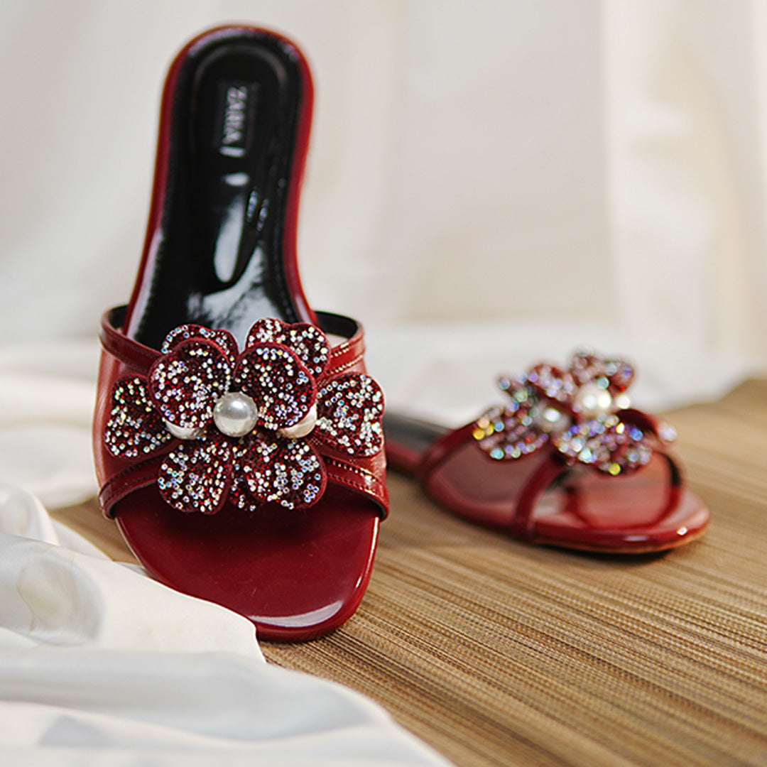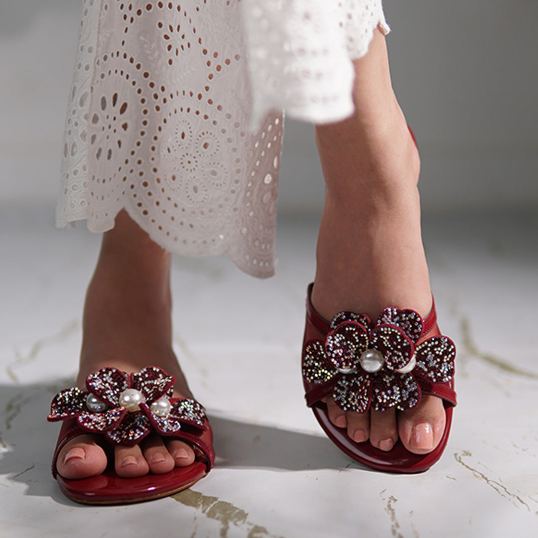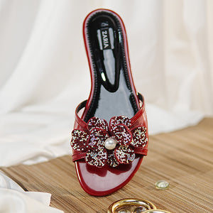 Bold, festive, and full of flair. This striking maroon sandal features a dual-layered glitter flower adorned with a soft pearl center, set on a sleek black insole. A perfect pick for weddings, festive gatherings, or statement evenings.