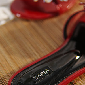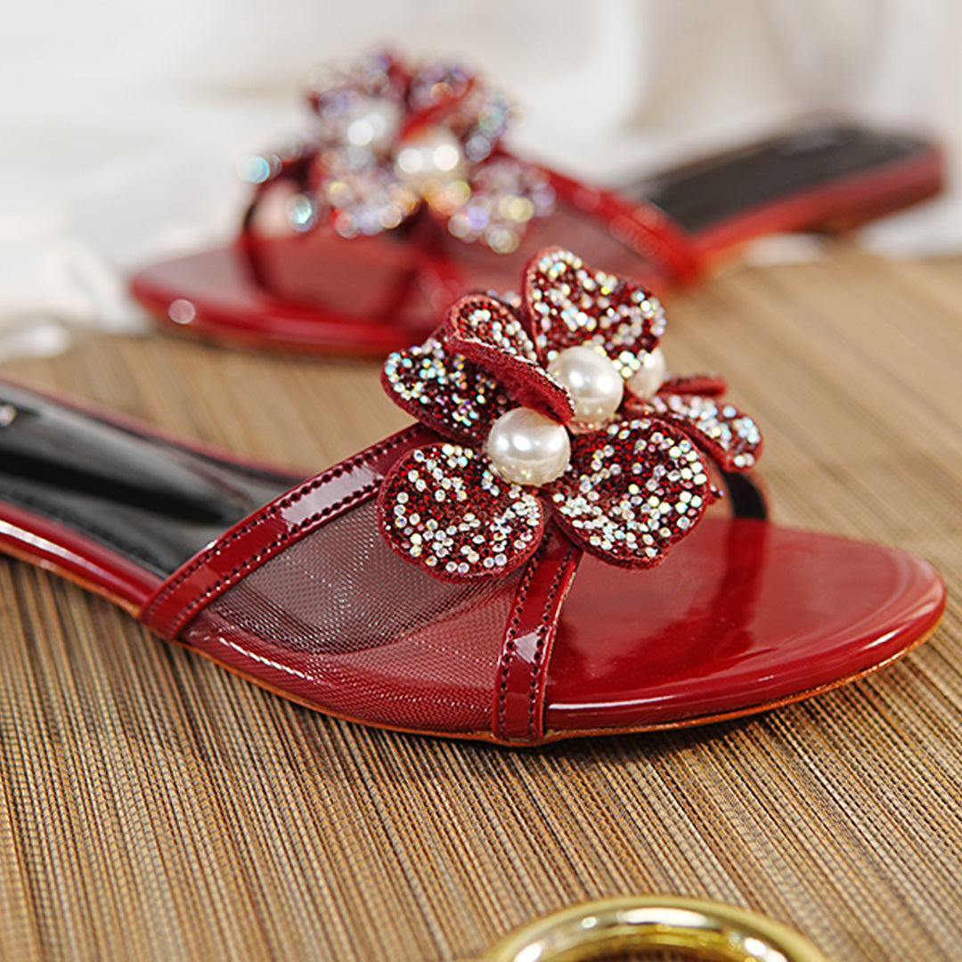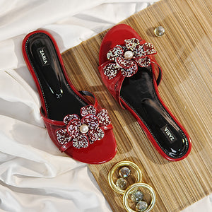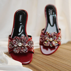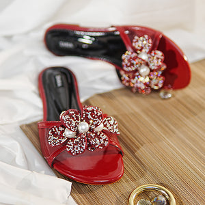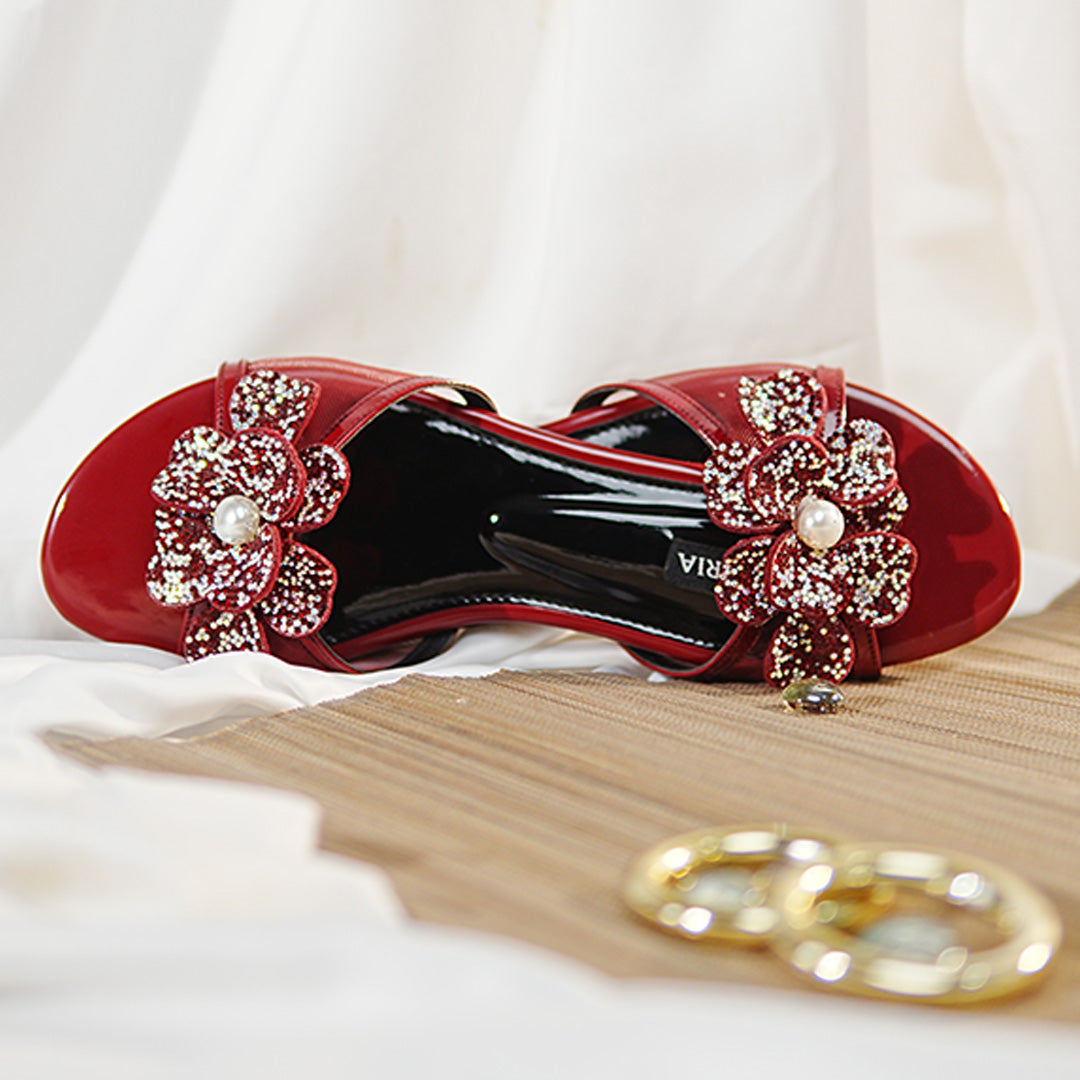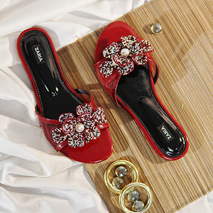 Bold, festive, and full of flair. This striking maroon sandal features a dual-layered glitter flower adorned with a soft pearl center, set on a sleek black insole. A perfect pick for weddings, festive gatherings, or statement evenings.