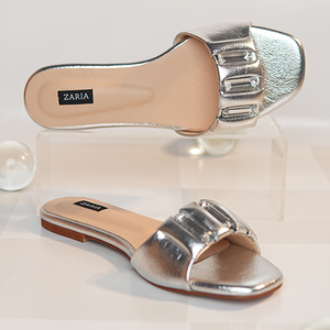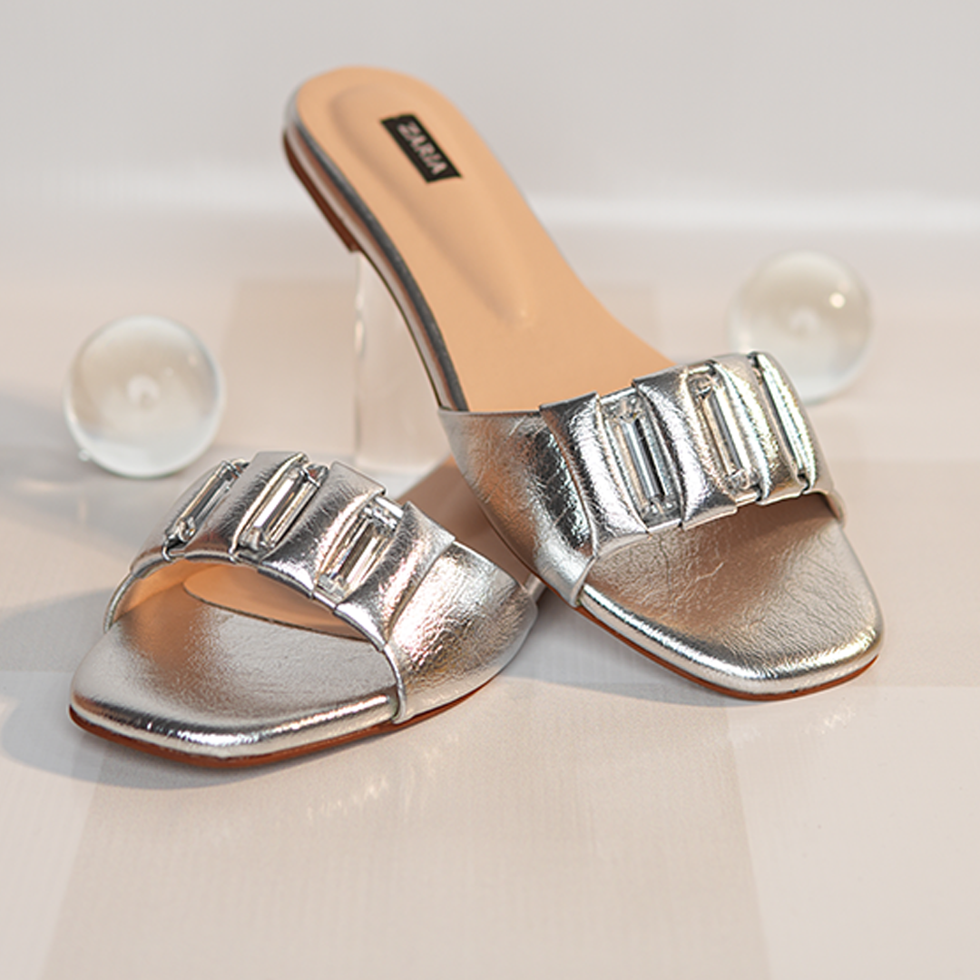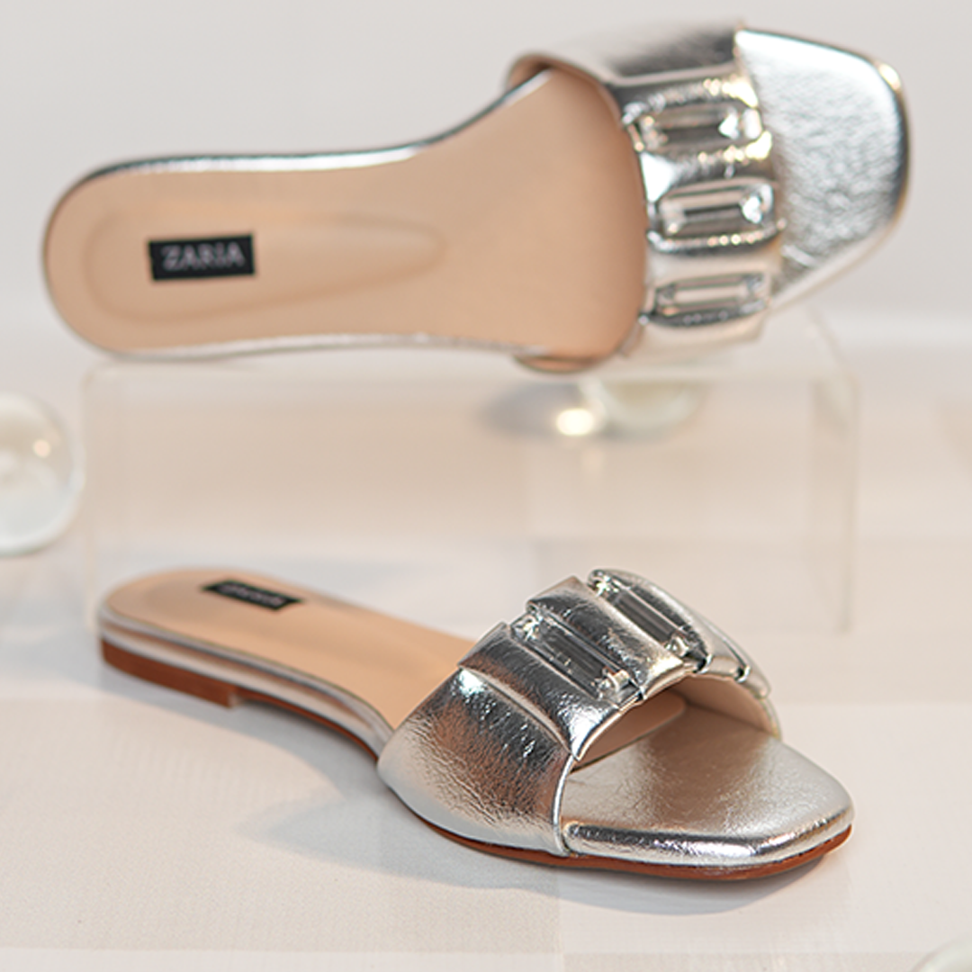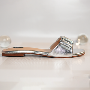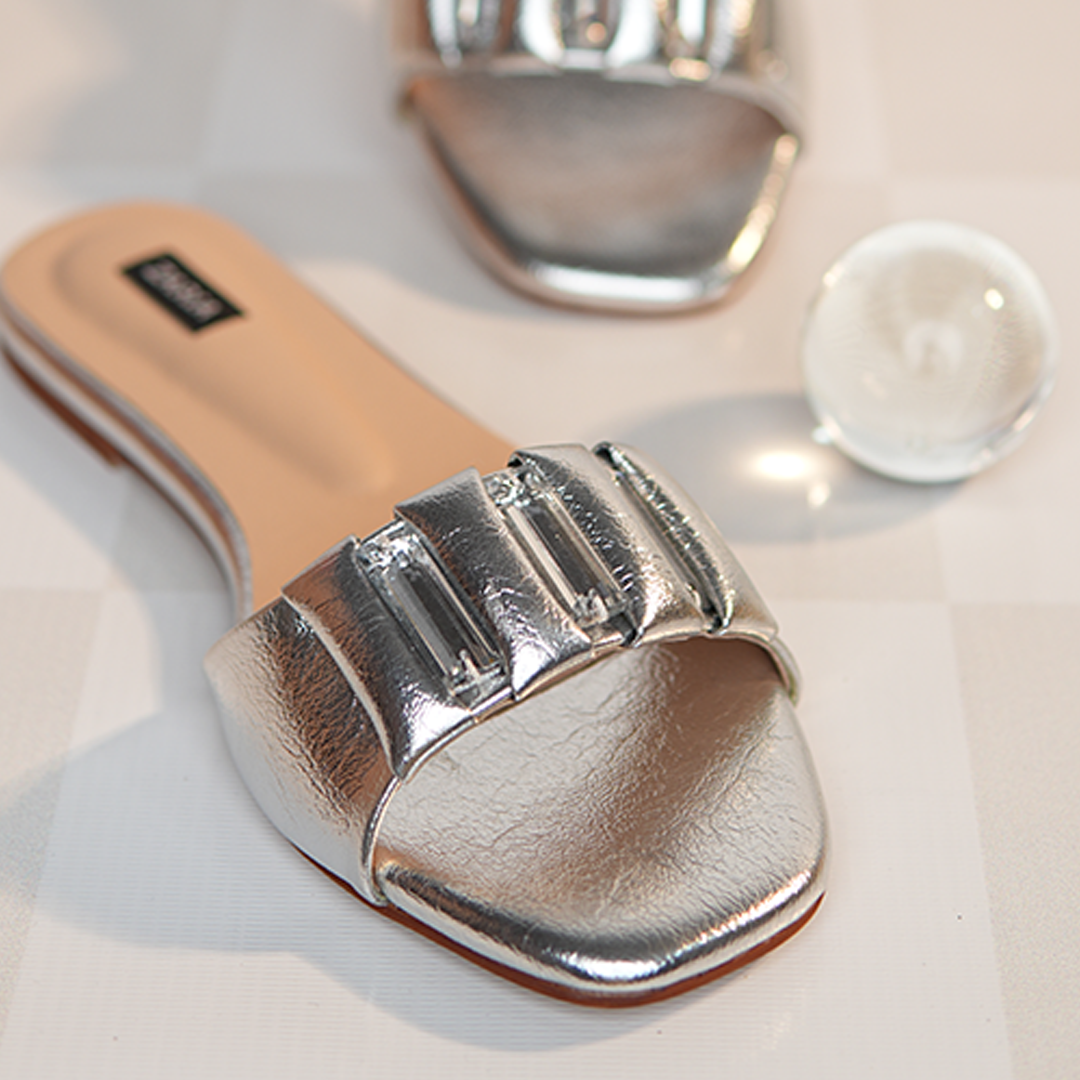Rivia flat highlights hand-set baguette crystals over a smooth metallic silver finish, bringing statement shine with all-day comfort.