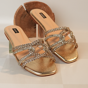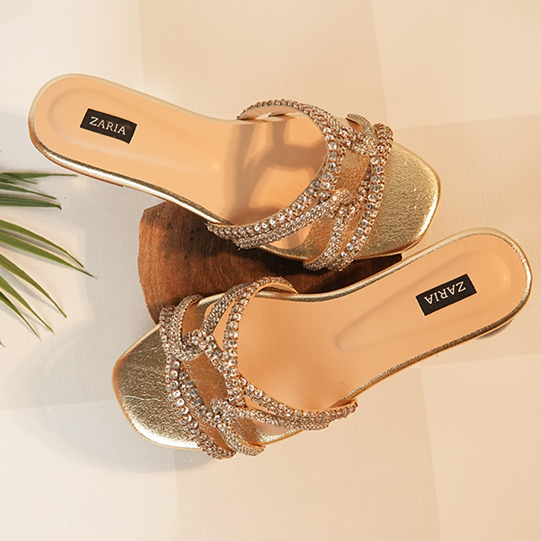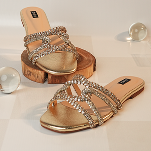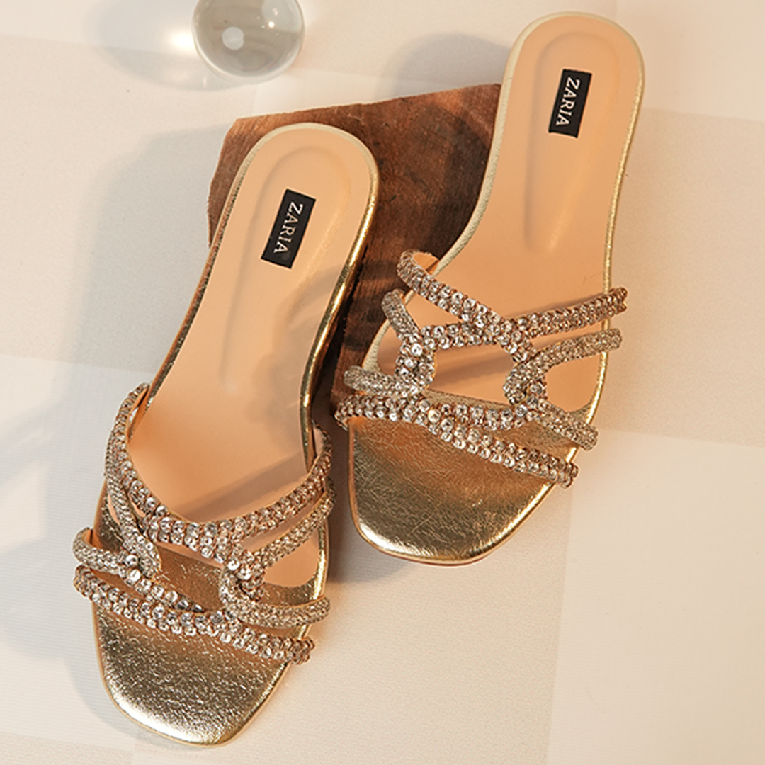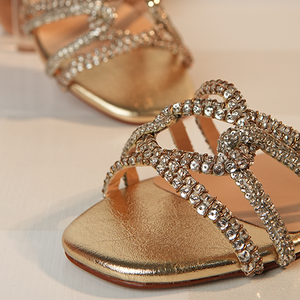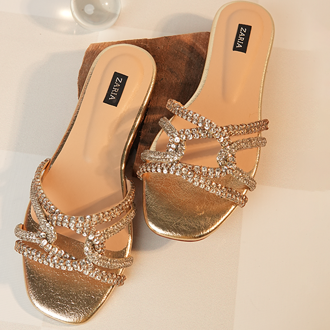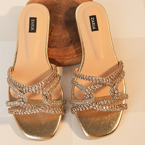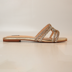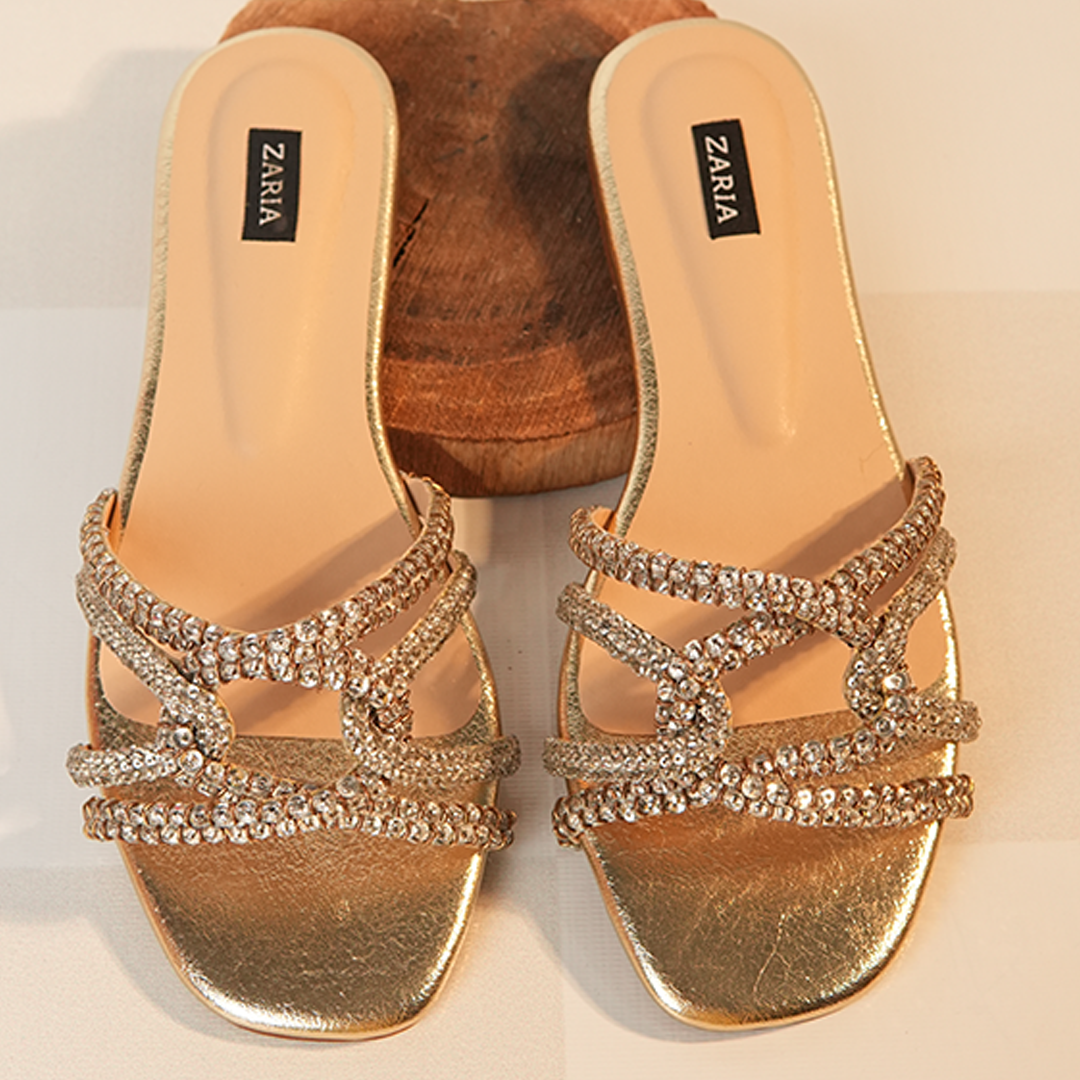 Zarah flat features our signature handmade straps, delicately stitched with crystals and rhinestones.