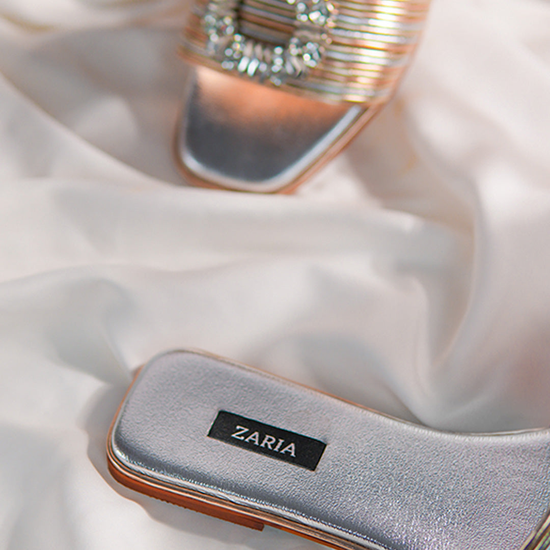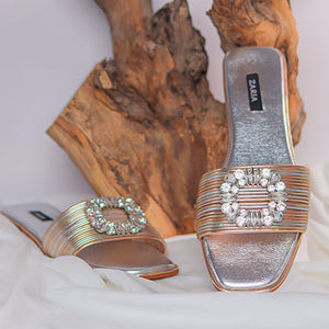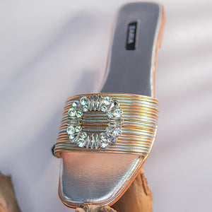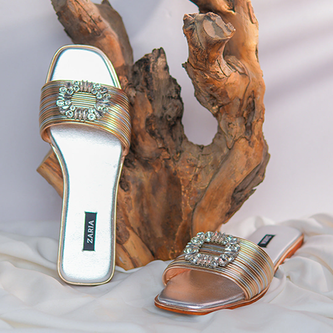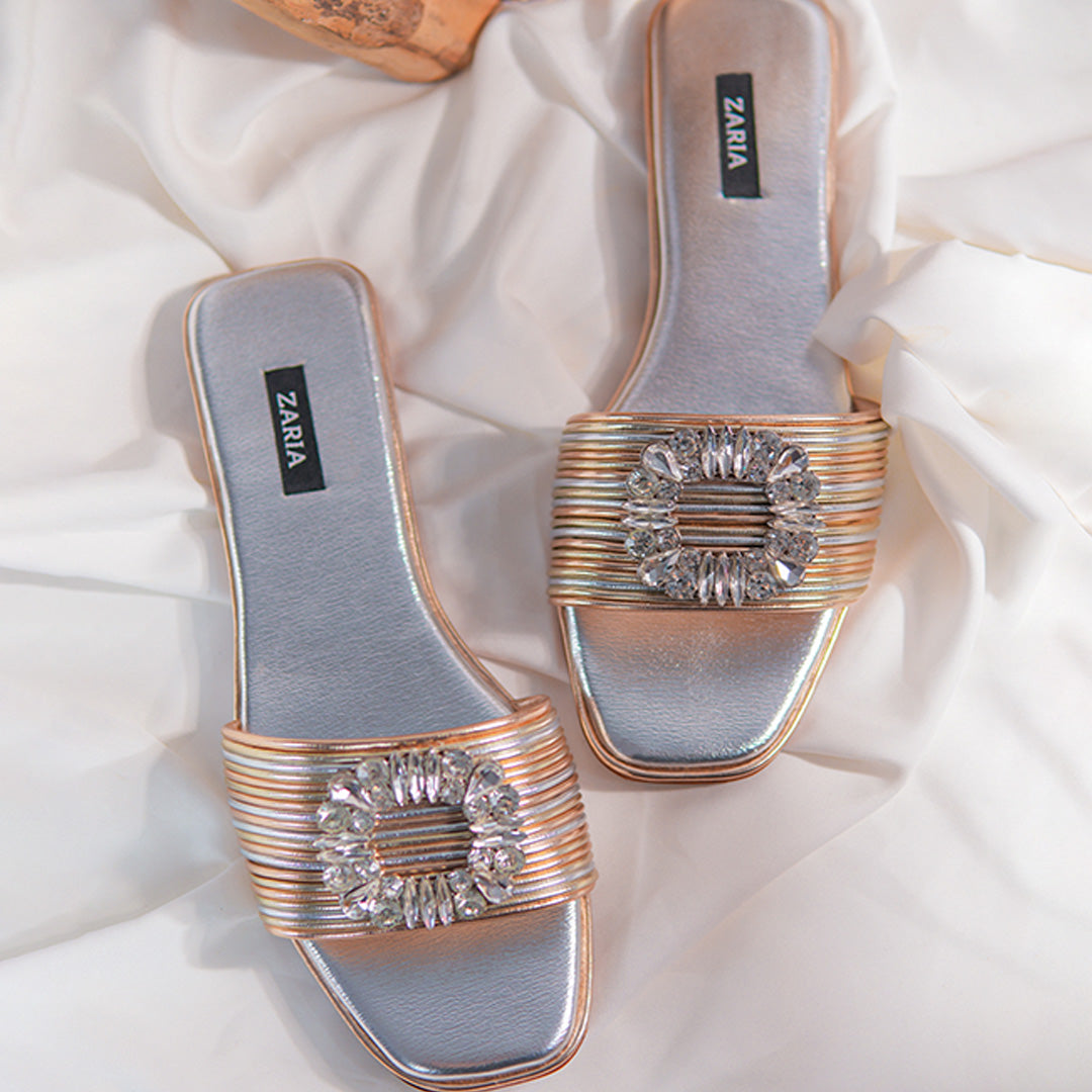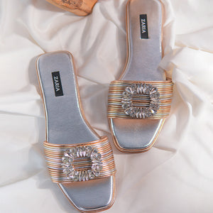 Zyra is designed for the modern woman who loves elegance with a touch of glamour. Featuring a metallic silver-gold pleated strap and a dazzling crystal embellishment.