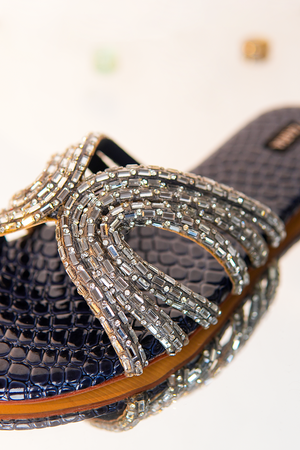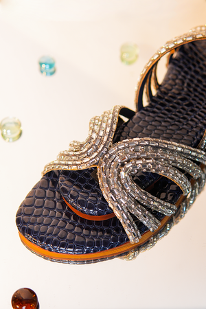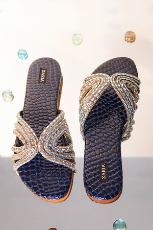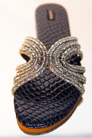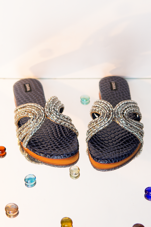 Add a touch of glam to your every step with these stunning navy sliders adorned with intricate crystal embellishments. Perfect for making a statement, whether you're dressing up or keeping it casual. ✨
