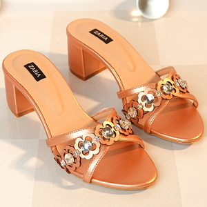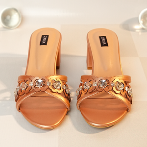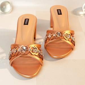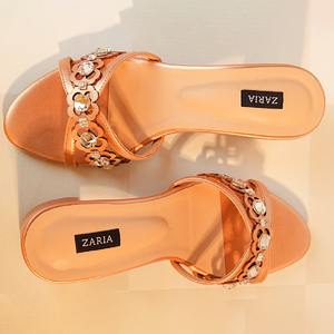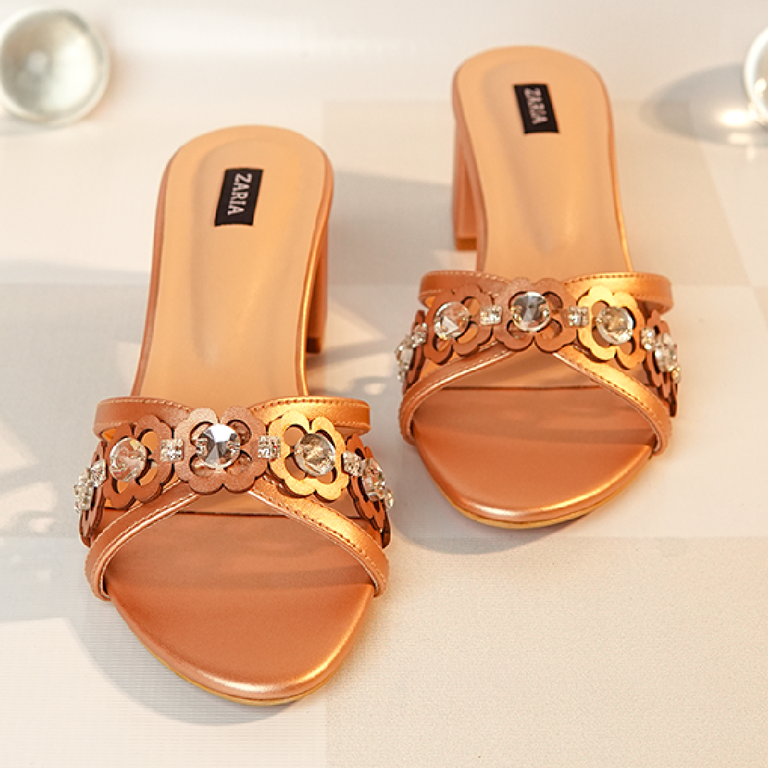 Lumira brings a soft rose-gold elegance to the Aurelia Collection. Its handcrafted detailing features stitched stones paired with delicate laser-cut florals, creating a refined, signature touch unique to Zaria Shoes. Designed on a 2.5-inch block heel.
