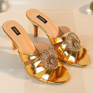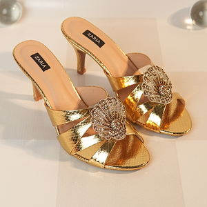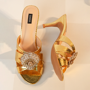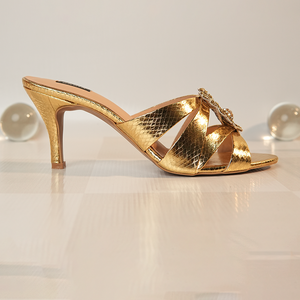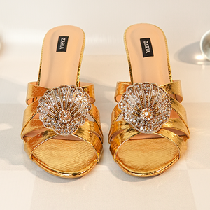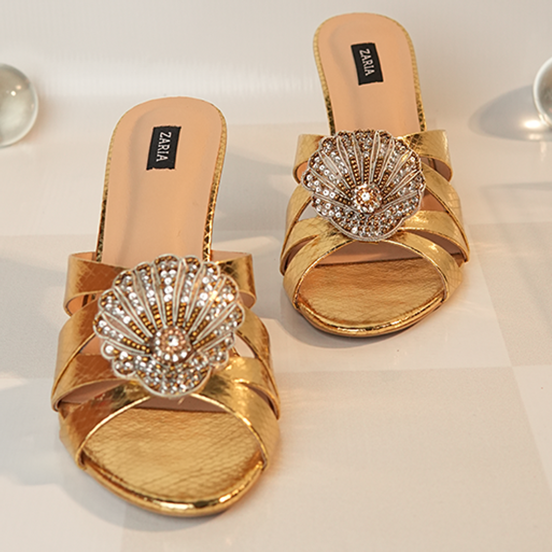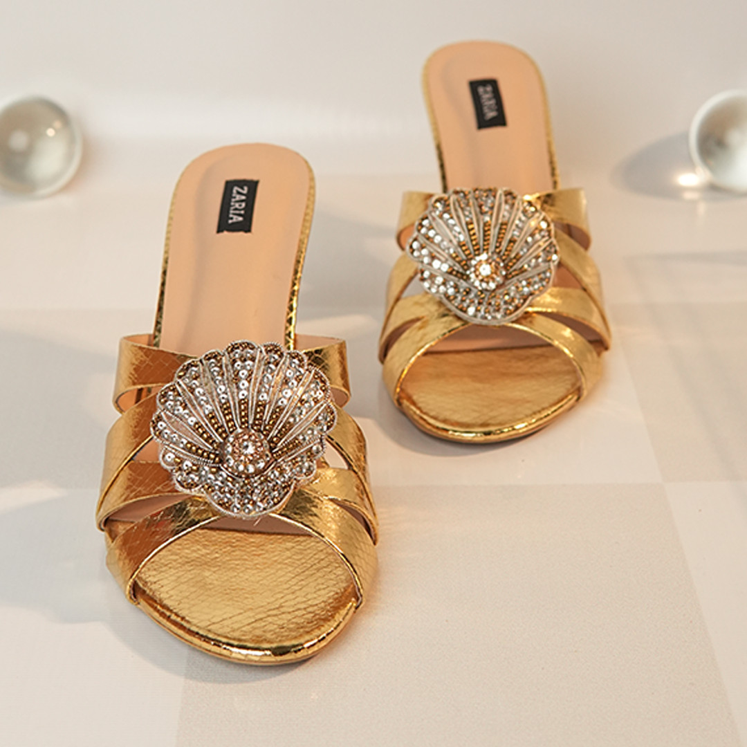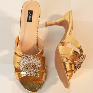 Orella is crafted in a radiant bright gold tone, featuring a beautifully handmade shell embellished with stones and rhinestones for a luxurious finish. Set on a 2.5-inch heel.Its an ideal choice for festive looks and the upcoming wedding season.