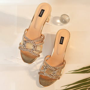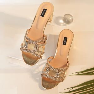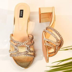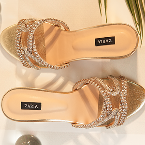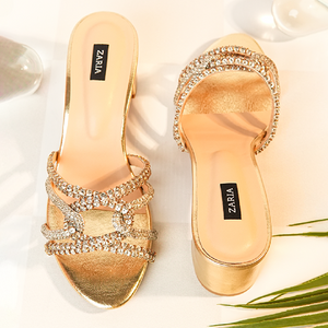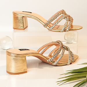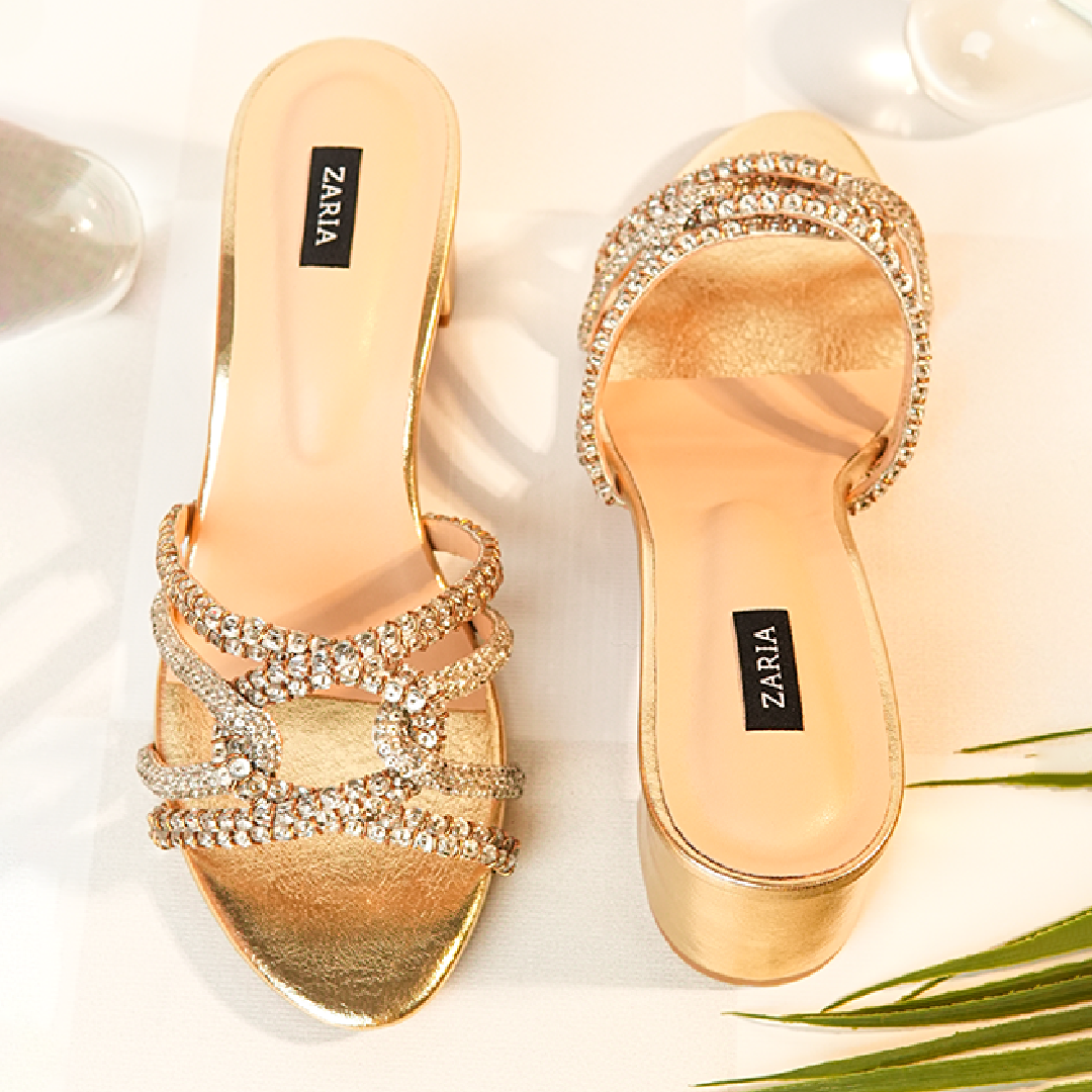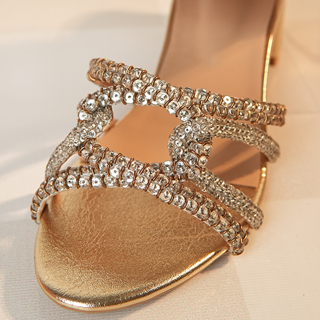 Zarah heel blends soft gold tones with handmade crystal-stitched straps for a luminous, elevated look.